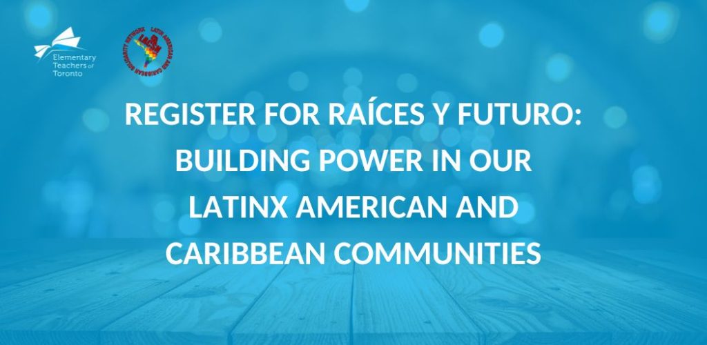 Join Latinx American and Caribbean educators, education workers, and allies for Raíces y Futuro: Building Power in Our Latin American and Caribbean Communities. DETAILS: Saturday, November 8, 2025 Workers Action Centre (720 Spadina Ave.). 4:30–8:00 p.m. ● 4:30–5:00 p.m. | Registration & refreshments ● 5:00 p.m. | Formal program begins Enjoy food, live music, […]