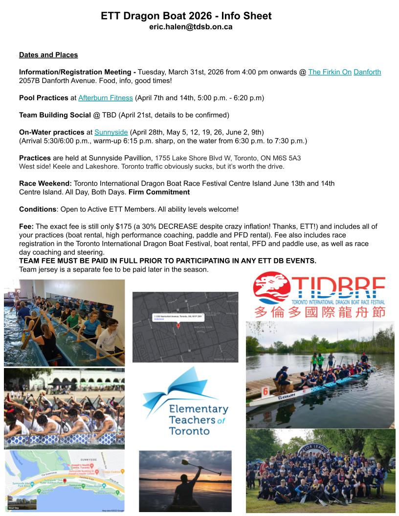 - The exact fee is still only $175 (a 30% DECREASE despite crazy inflation! Thanks, ETT!) and includes all of your practices (boat rental, high performance coaching, paddle and PFD rental). Fee also includes race registration in the Toronto International Dragon Boat Festival, boat rental, PFD and paddle use, as well as race day coaching and steering.